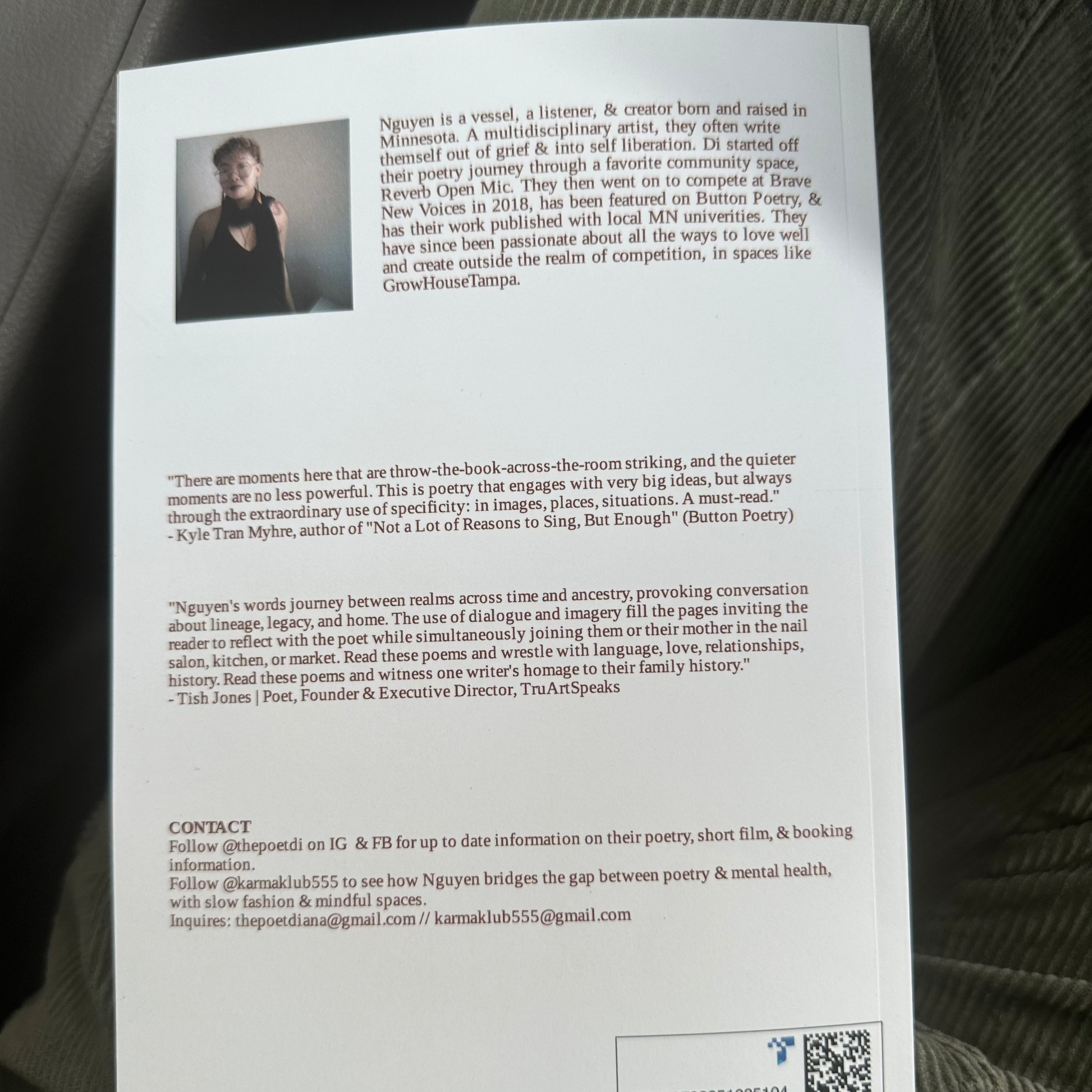In Kissing God's Gravel, Nguyen writes from their experience as a first generation Vietnamese American, learning through war, generational trauma, & suicide. All of their poems serve as prayers, pieces that lift them out of grief. Throughout their chapbook, join Nguyen as they cry, shed, jump, fall, laugh, die, and resurrects into more life.